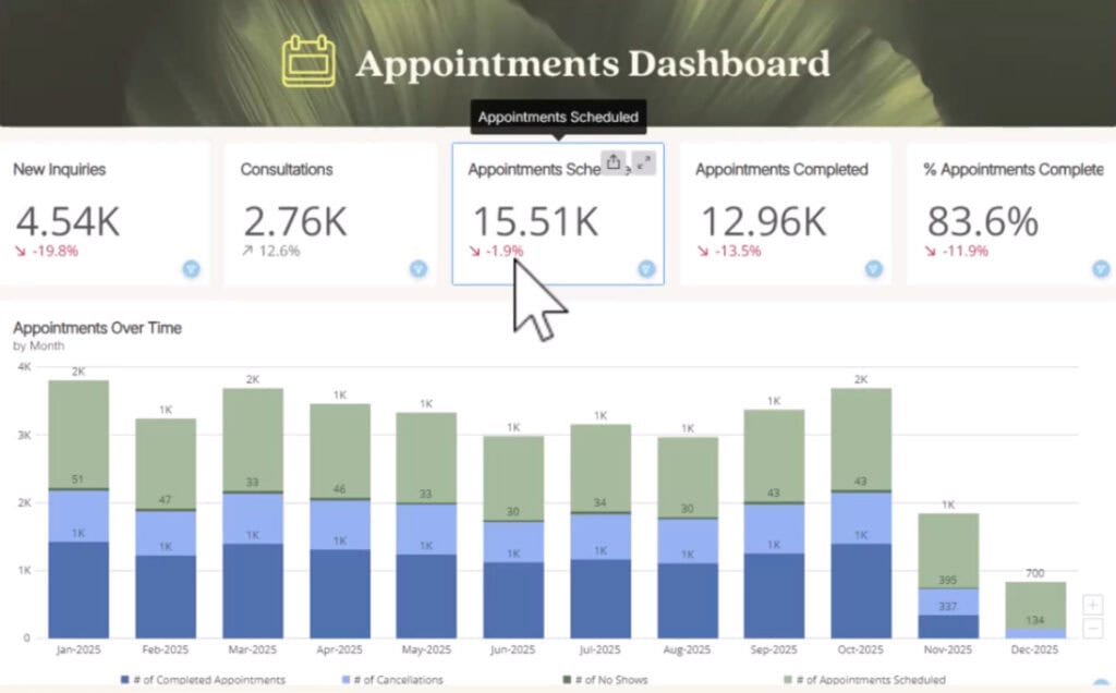 Also, the dashboards are visual and filterable. You see what matters when you need it without exporting data or building manual reports. For multi-location practices, centralized reporting removes the need to log into multiple systems. You get the full picture of performance in one place.