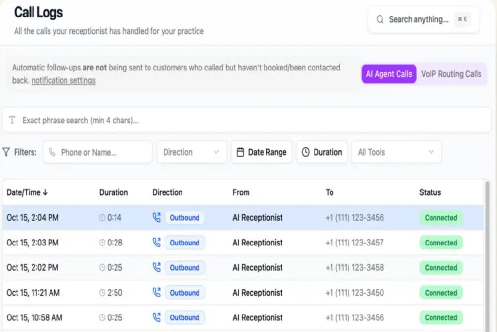 | Patient follow-up | Staff-driven outreach | Limited SMS | Concierge automation |