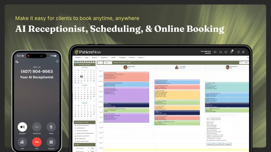 Phone-only booking creates friction, and online scheduling should be mobile-friendly, show real-time availability, allow quick selection, and provide instant confirmation. For instance, PatientNow directly embeds online booking for med spas into your site, removing barriers and keeping more leads in the pipeline.