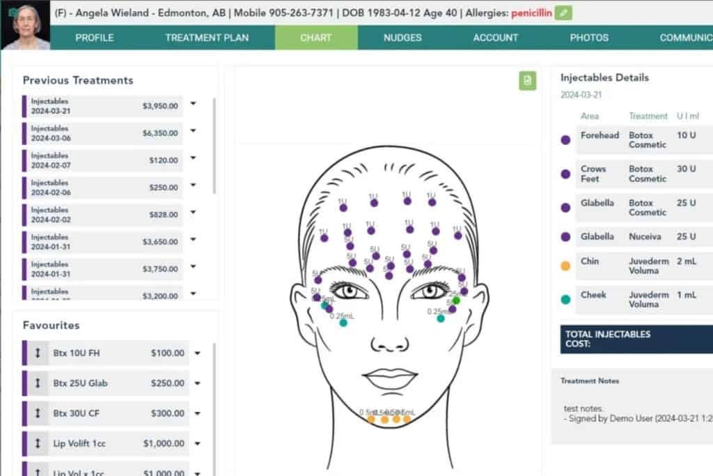 - Aesthetic Charting: Customizable chart templates with image annotation, synchronized pricing, integrated eForms, and detailed treatment documentation.