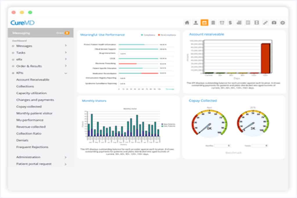 • Analytics: Practice performance dashboards with clinical and financial reporting.