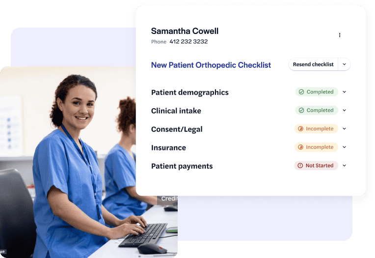 - Patient experience flows: Patients are walked through required intake tasks step by step to avoid confusion or missed forms.