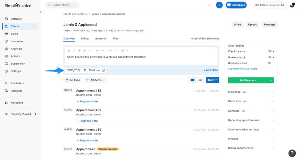 - Integrated intake: Intake information links directly to both billing workflows and clinical documentation.