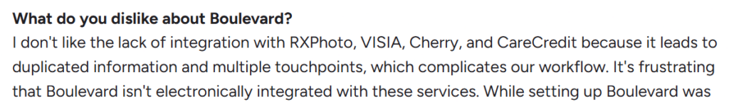 Boulevard lacks core med spa tools. Users note that there’s no e-prescribing, no labs integration, no weight-loss tracking, and no advanced before-and-after photo workflows.