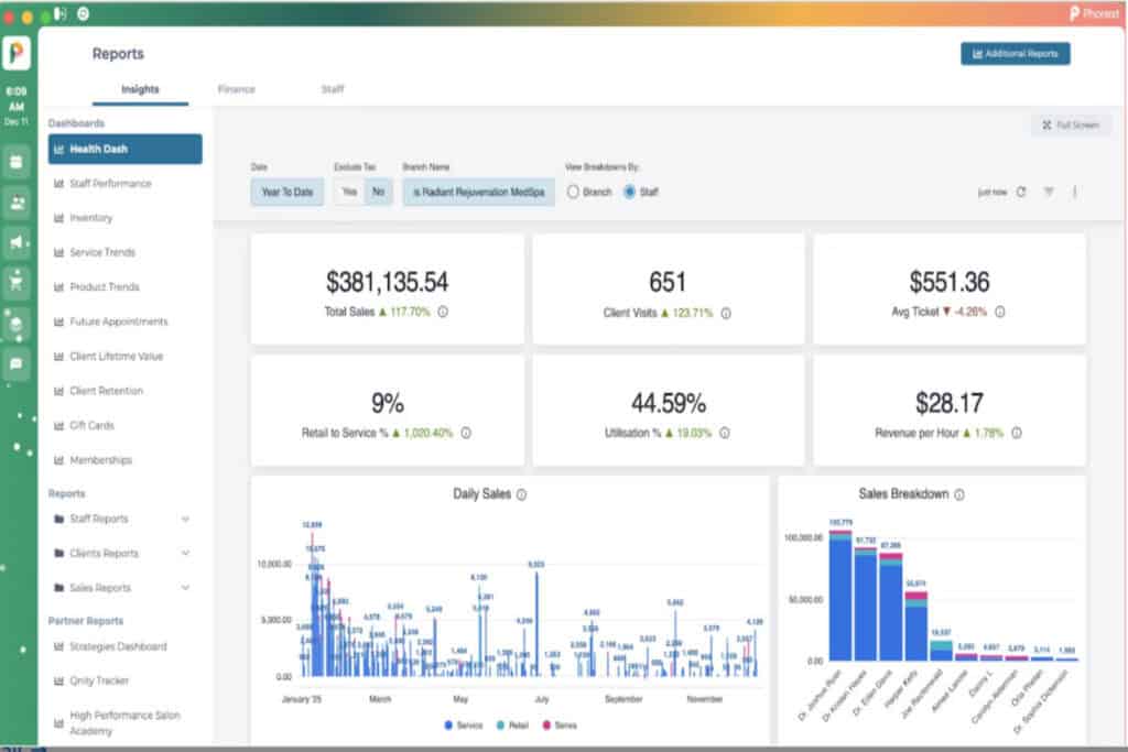 - Practice & Revenue Tools: Track staff, KPIs, inventory, memberships, and payments in one place, with QuickBooks sync and next-day funding for easy financial management.